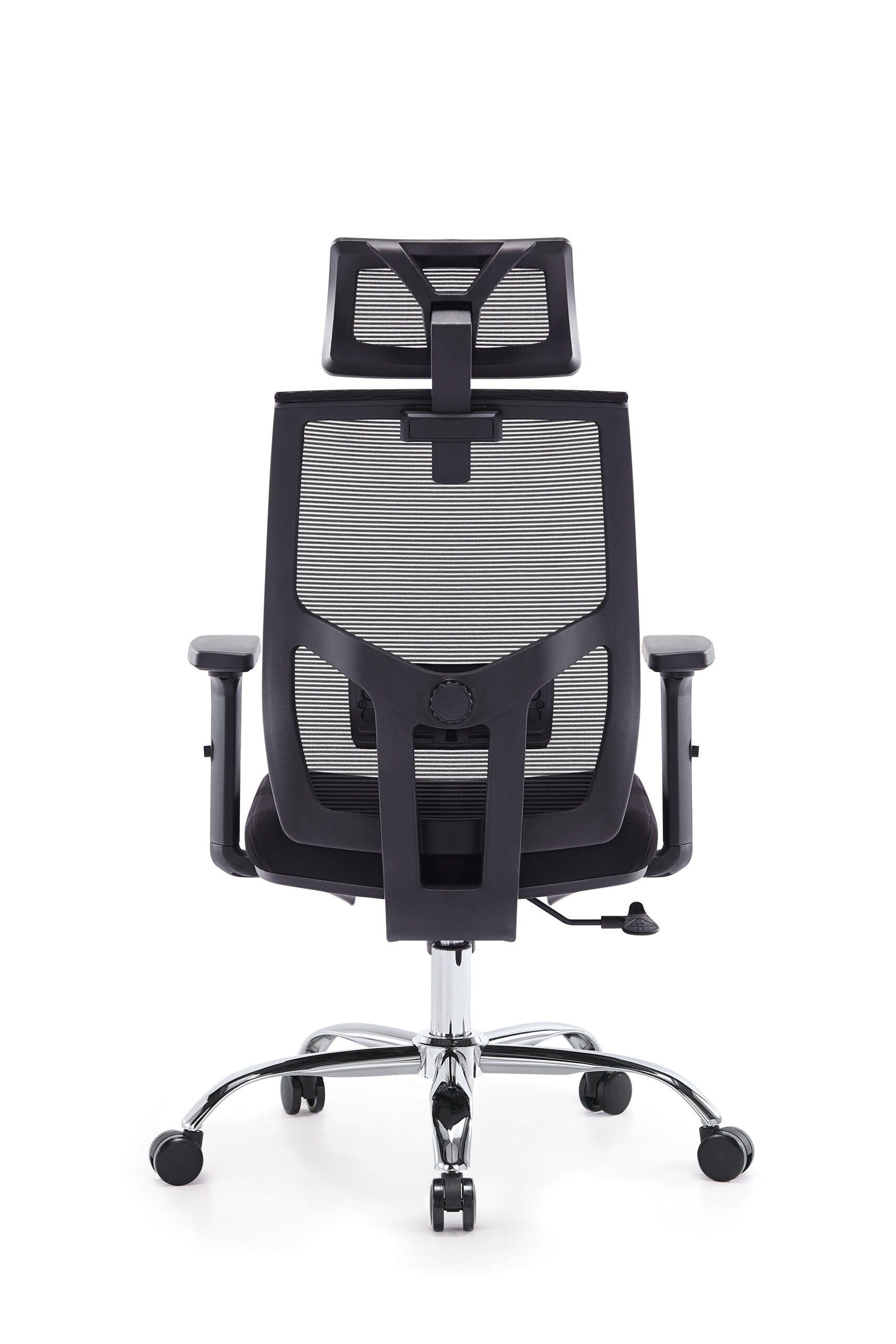 High Back Rev Chair, Black Frame Mesh back & fabric seat Adjustable headrest fixed armrest class 3 gaslift Upright one locking mechanism 320mm chrome base with castor 2 Pcs/Ctn Packing.